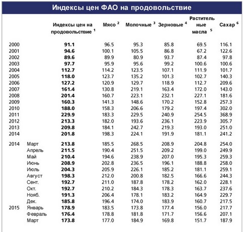 Также в марте из-за резкого снижения стоимости сахара снизился индекс продовольственных цен ФАО (организация ООН), который представляет собой средневзвешенный показатель международных цен на пять основных групп продовольственных товаров. В марте он составил 173, 8 против 179,4 пунктов в феврале.