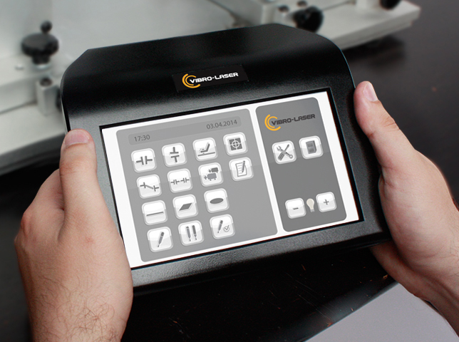 Дисплейный блок системы «VIBRO-LASER 5M»® имеет эргономичный дизайн, небольшой вес и выполнен из ударопрочного ABS-пластика. Абсолютно новый пошаговый, интуитивно-понятный интерфейс с 3D-анимацией и большой7-дюймовый сенсорный экран упрощают работу оператору и сокращают время на проведение работ, а уникальная система управления памятью позволяет сохраниться на любом этапе центровки и вернуться к нему в любой момент.
